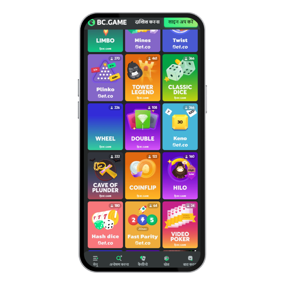 - BC.Game ऐप के माध्यम से खेले जाने वाले गेम